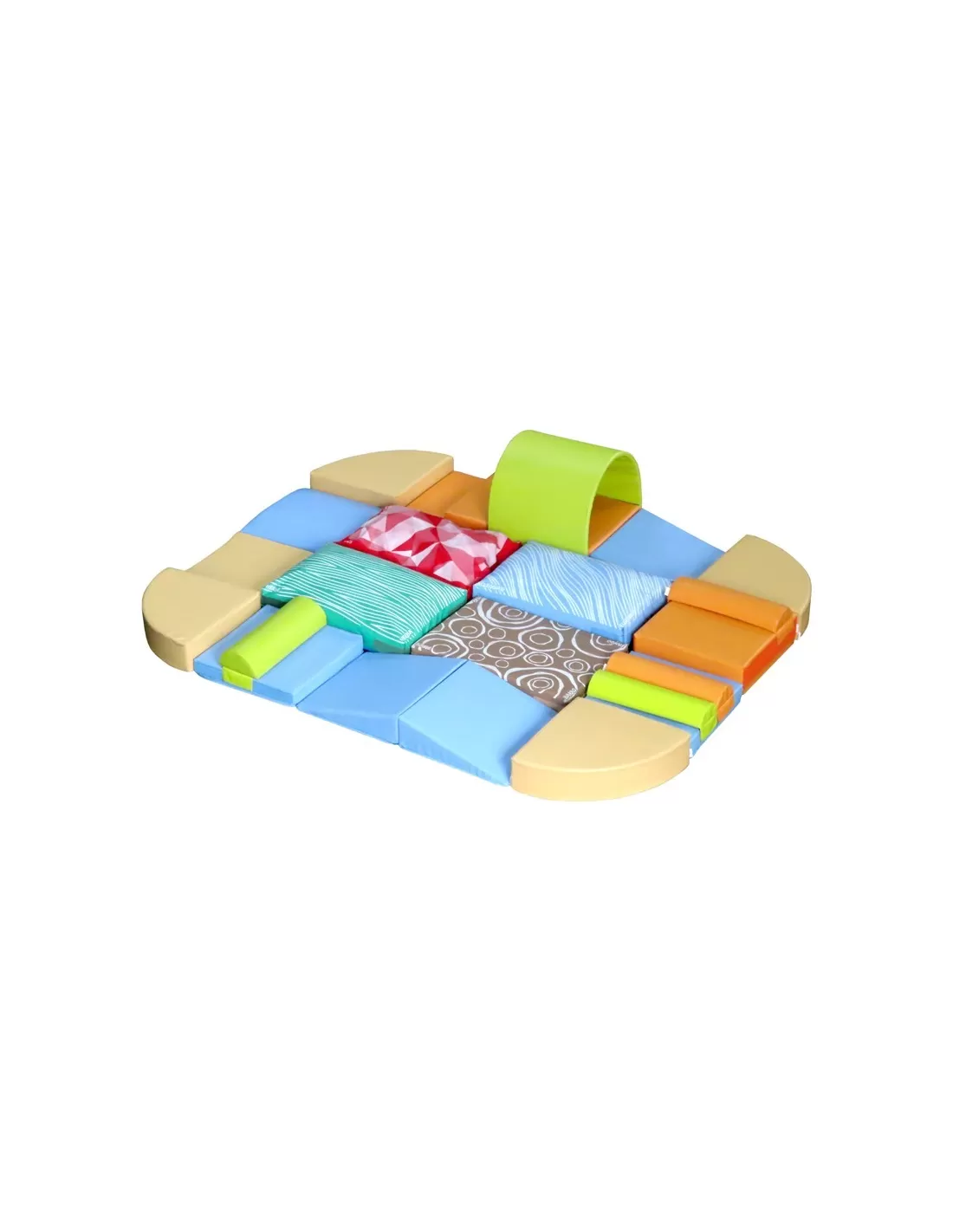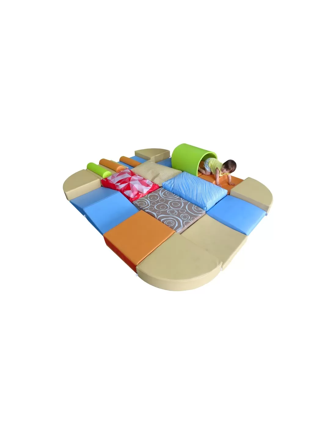 Conjunto de 19 piezas + 4 obstáculos que incluye: 4 quesito mosaico, 1 bloque sensorial flotante, 1 bloque sensorial barro, 1 bloque sensorial hierba, 1 bloque sensorial piedra, 1 escalera, 2 bloques con velcro de 7,5cm de altura, 4 semicilindro, 3 rampas, 1 bloque-túnel, 1 pieza ondulada doble, 1 bloque con velcro de 15cm de altura.